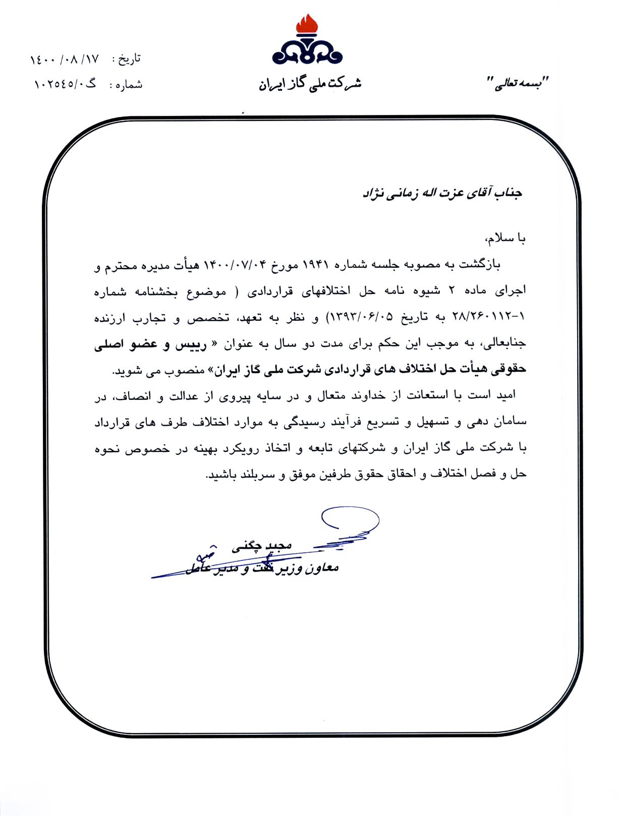 «بازگشت به مصوبه جلسه شماره ۱۹۴۱ مورخ ۱۴۰۰.۰۷.۰۴ هیئتمدیره محترم و اجرای ماده ۲ شیوهنامه حل اختلافهای قراردادی و نظر به تعهد، تخصص و تجارب ارزنده جنابعالی، به موجب این حکم برای مدت دو سال به عنوان رئیس و عضو اصلی حقوقی هیئت حل اختلافهای قراردادی شرکت ملی گاز ایران منصوب میشوید.