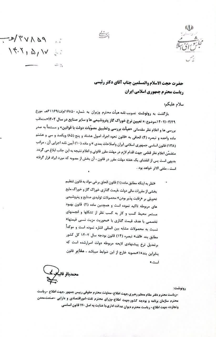 رئیس مجلس درباره لغو مصوبه افزایش نرخ خوراک گاز پتروشیمی ها در هیات تطبیق مصوبات دولت به رئیس جمهور نامه نوشت و خوستار اعلام نظر قطعی ظرف یک هفته شد.