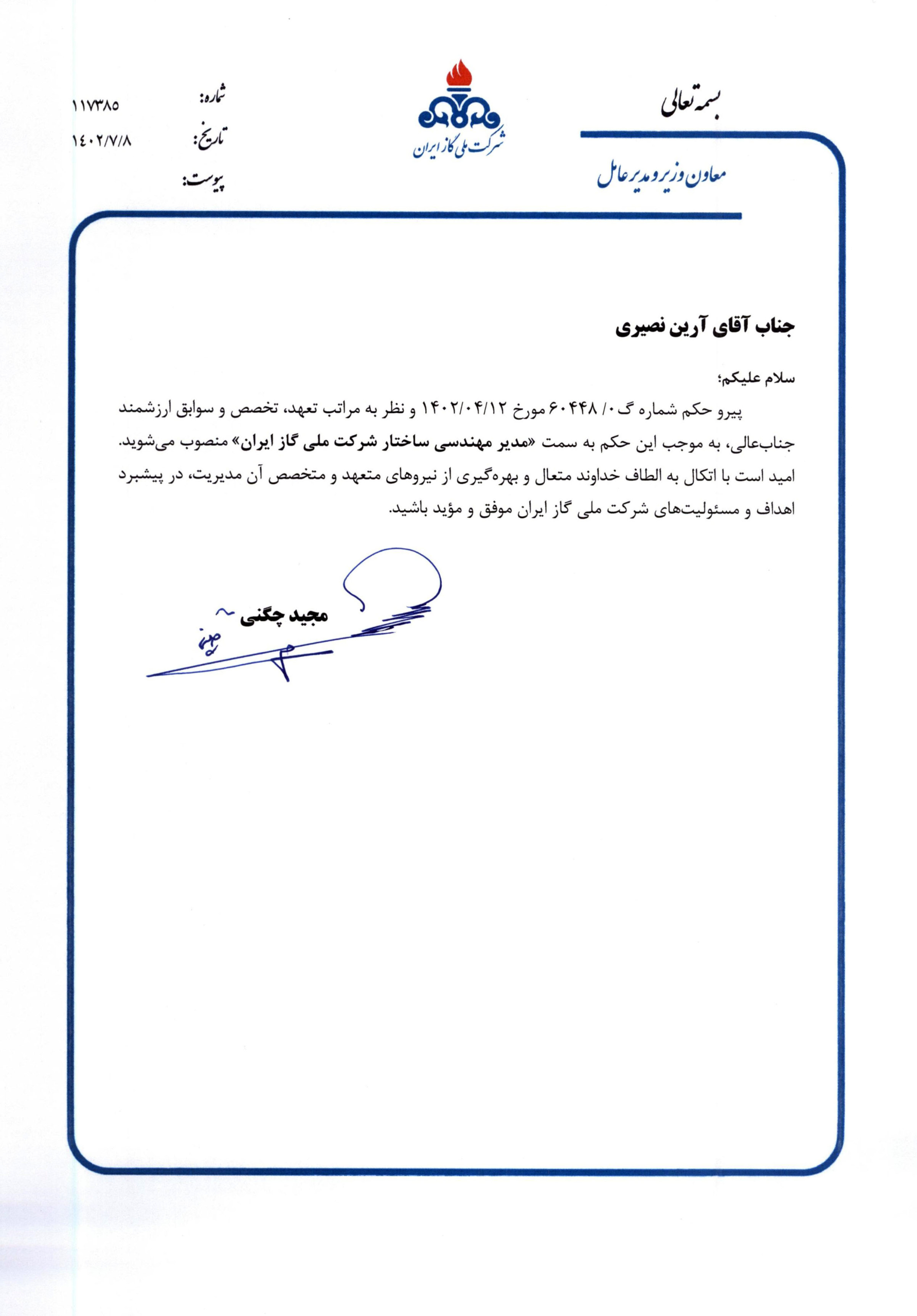 معاون وزیر نفت در امور گاز در حکمی آرین نصیری را «مدیر مهندسی ساختار شرکت ملی گاز ایران» را منصوب کرد.