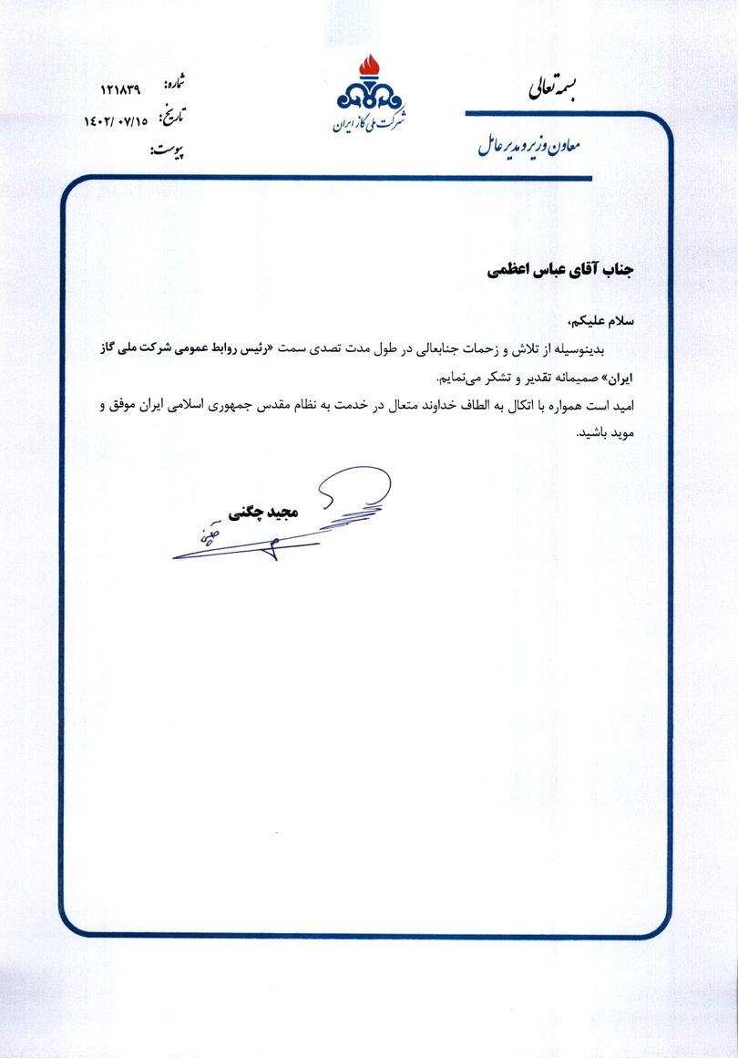 وی همچنین در پیامی از زحمات و تلاشهای عباس اعظمی در طول مدت تصدی سمت رئیس روابط عمومی شرکت ملی گاز ایران قدردانی کرد.