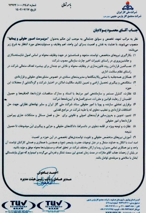 گفتنی است؛ در قسمت پایانی حکم صادره از احمد باهوش، مدیرعامل مجتمع گاز پارس جنوبی نیز آمده است: