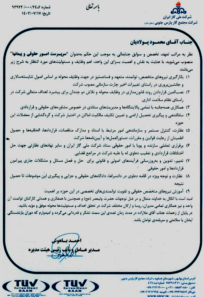 سرپرست امور حقوقی و پیمان های مجتمع گاز پارس جنوبی منصوب شد