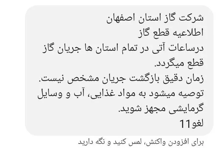 بر اساس این اطلاعیه، هرگونه پیامک ارسالی با مضمون قطعی گاز در شهرها و روستاها جعلی است و مردم به این شایعات توجه نکنند.