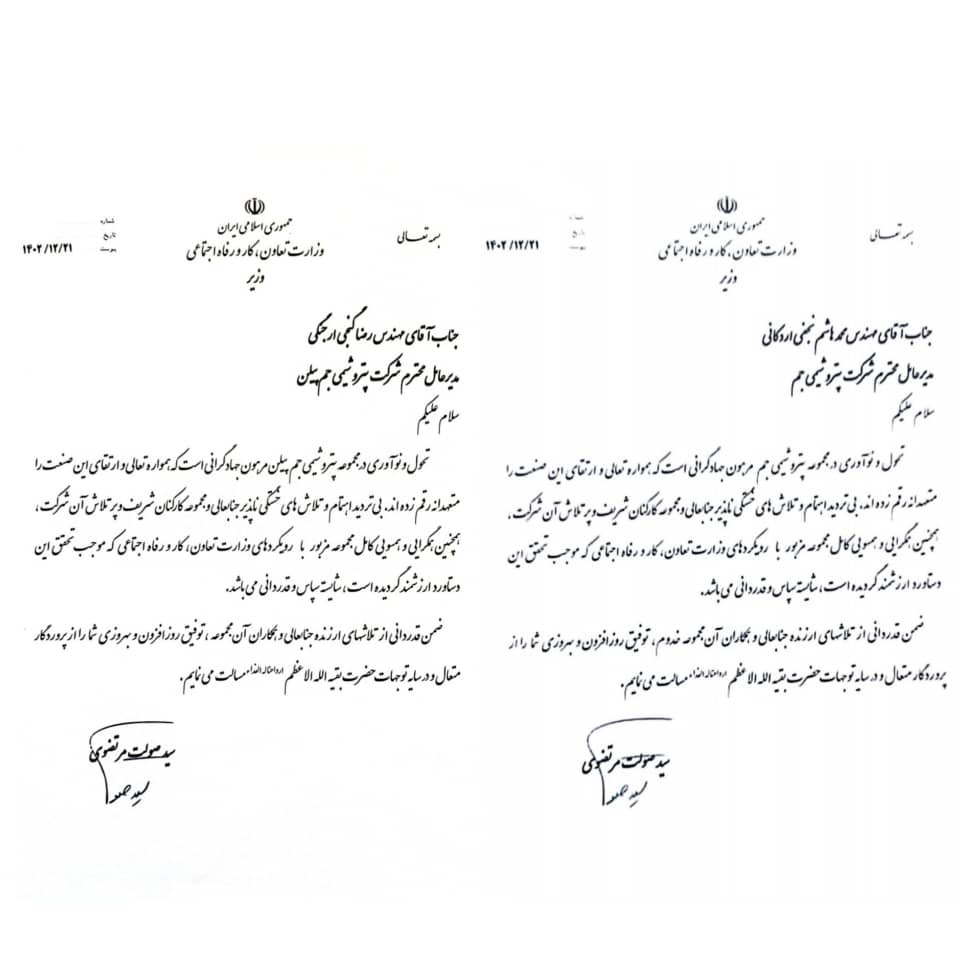 تقدیر وزیر تعاون، کار و رفاه اجتماعی از مدیران عامل شرکتهای پتروشیمی جم و پتروشیمی جمپیلن