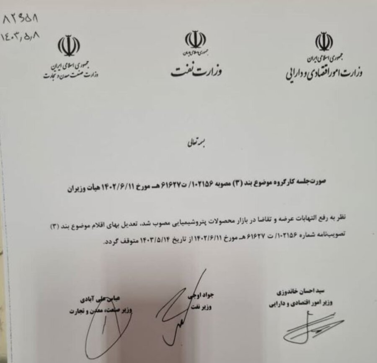 سازمان بورس و اوراق بهادار اعلام کرد: سه وزیر اقتصاد، نفت، صمت ضمن امضای صورتجلسهای، با حذف دلار ۲۸.۵۰۰ تومانی پلی استایرن و پت بطری و نساجی موافقت کردند.