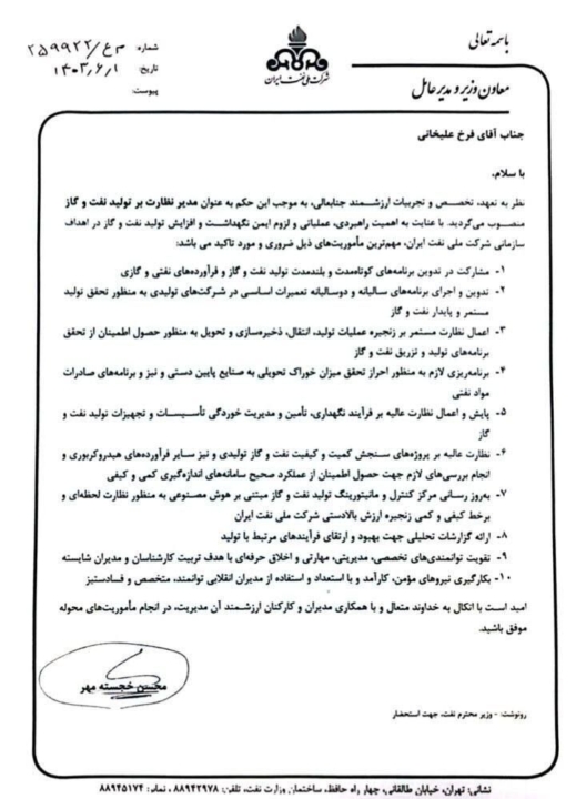 مدیرعامل شرکت ملی نفت ایران در حکمی فرخ علیخانی را بهعنوان مدیر نظارت بر تولید نفت و گاز این شرکت منصوب کرد.