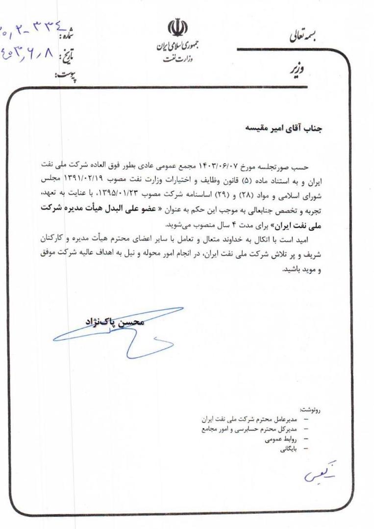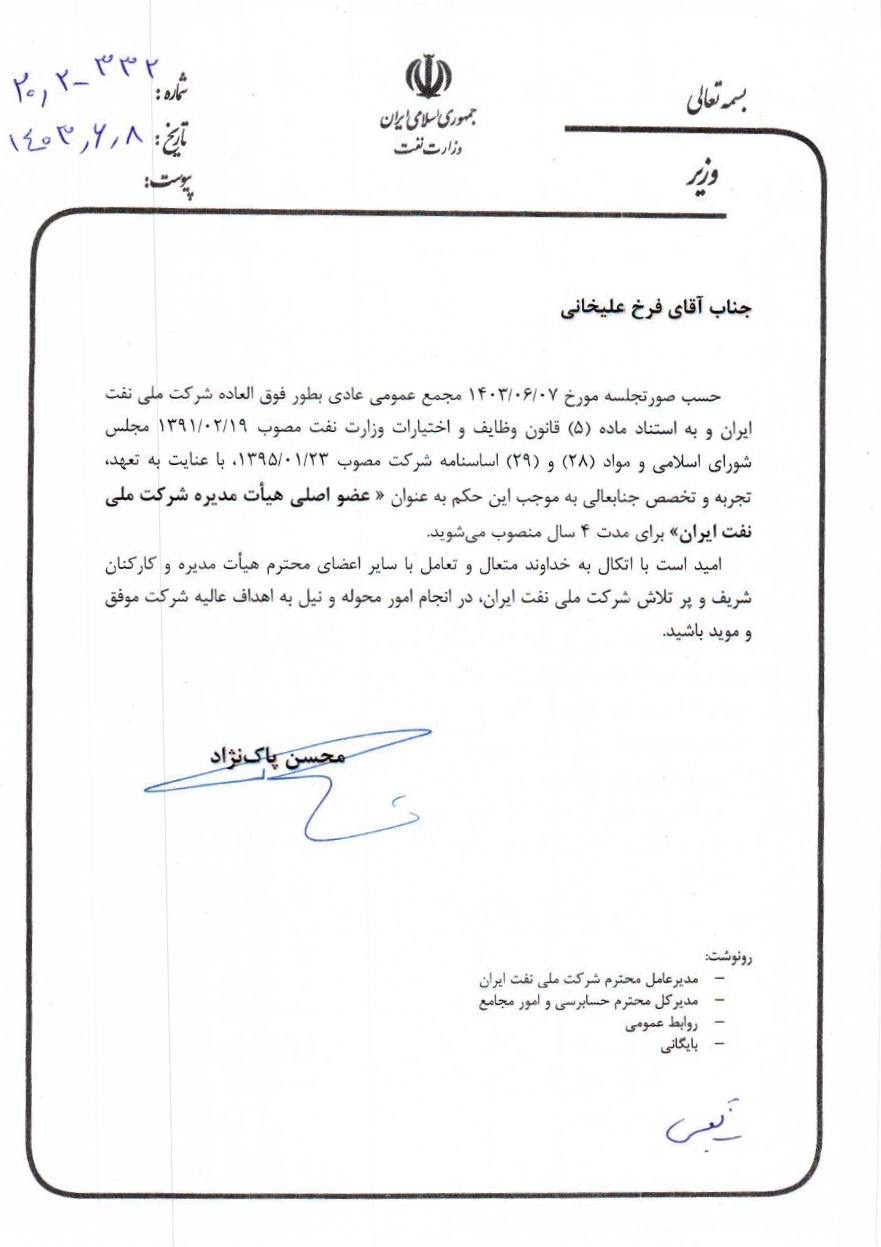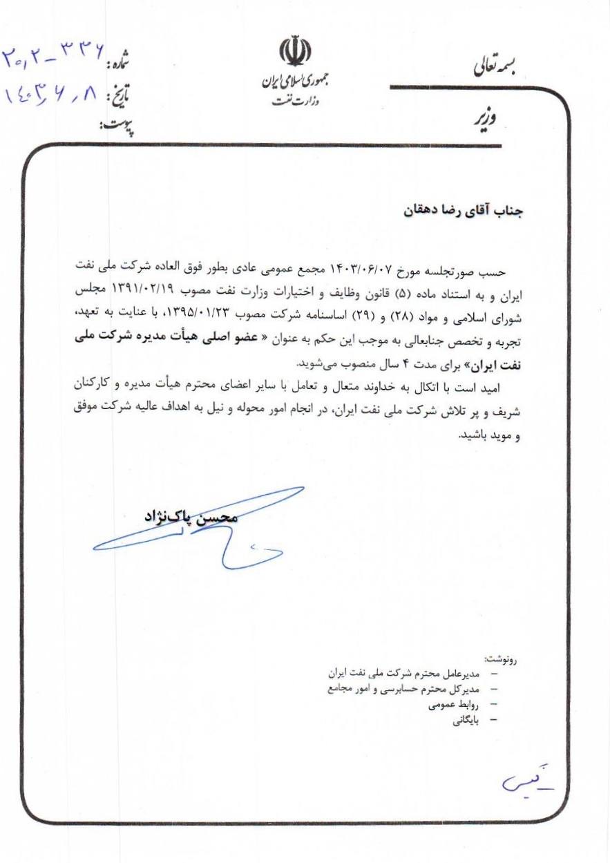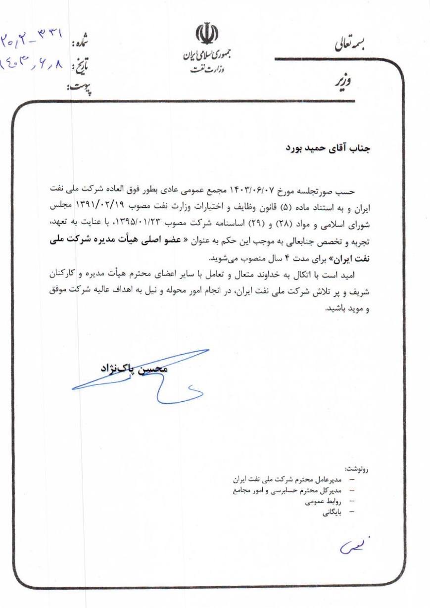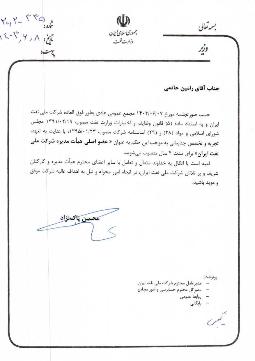 «حسب صورتجلسه مورخ ۱۴۰۳/۰۶/۰۷ مجمع عمومی عادی بطور فوق العاده شرکت ملی نفت و به استناد ماده (۵) قانون وظایف و اختیارات وزارت نفت مصوب ۱۳۹۱/۰۲/۱۹ مجلس شورای اسلامی و مواد (۲۸) و (۲۹) اساسنامه شرکت مصوب ۱۳۹۵/۱/۲۳، با عنایت به تعهد، تجربه و تخصص جنابعالی به موجب این حکم بهعنوان «عضو اصلی هیئت مدیره شرکت ملی نفت ایران» و «عضو علی البدل هیئت مدیره شرکت ملی نفت ایران» برای مدت چهار سال منصوب میشوید.