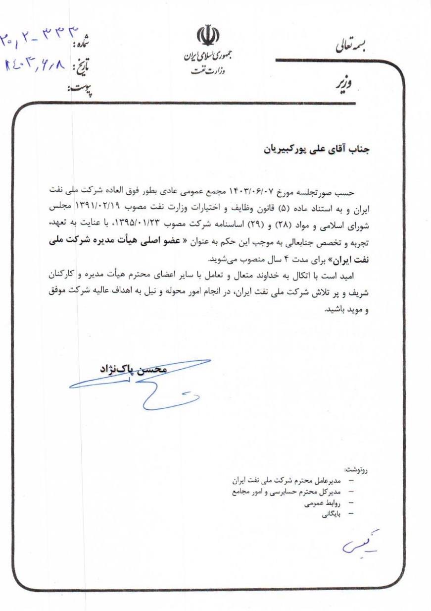 به گزارش رویداد نفت، در متن مشترک حکم محسن پاکنژاد به علی پورکبیربان، فرخ علیخانی، رضا دهقان، رامین حاتمی و حمید بورد بهعنوان اعضای اصلی هیئت مدیره شرکت ملی نفت ایران و امیر مقیسه بهعنوان اعضای علیالبدل هیئت مدیره شرکت ملی نفت ایران آمده است: