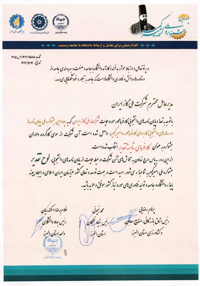 در بخشی از این لوح تقدیر آمده است: «…به پاس ارج نهادن به تلاشهای آن شرکت در حیطه حمایت از پایاننامههای دانشجویی، لوح تقدیر جشنواره ملی امیرکبیر به شما اهداء میشود…»