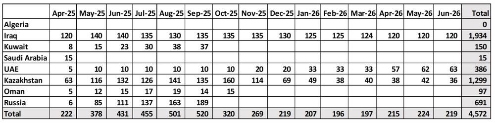 به گزارش رویداد نفت به نقل از دبیرخانه سازمان کشورهای صادرکننده نفت (اوپک)، دبیرخانه اوپک روز چهارشنبه (۲۷ فروردین ۱۴۰۴) مطابق تصمیم نشست مجازی روز سوم آوریل ۲۰۲۵ (پنجشنبه، ۱۴ فروردین) هشت کشور عضو ائتلاف تولیدکنندگان عضو اوپک و متحدانش (اوپکپلاس) از جمله عربستان سعودی، روسیه، عراق، امارات متحده عربی، کویت، قزاقستان، الجزایر و عمان که در قالب توافق کاهش عرضه داوطلبانه، مقدار بیشتری از تولید خود کاستهاند، تازهترین برنامه جبرانی را مطابق جدول زیر دریافت کرد: