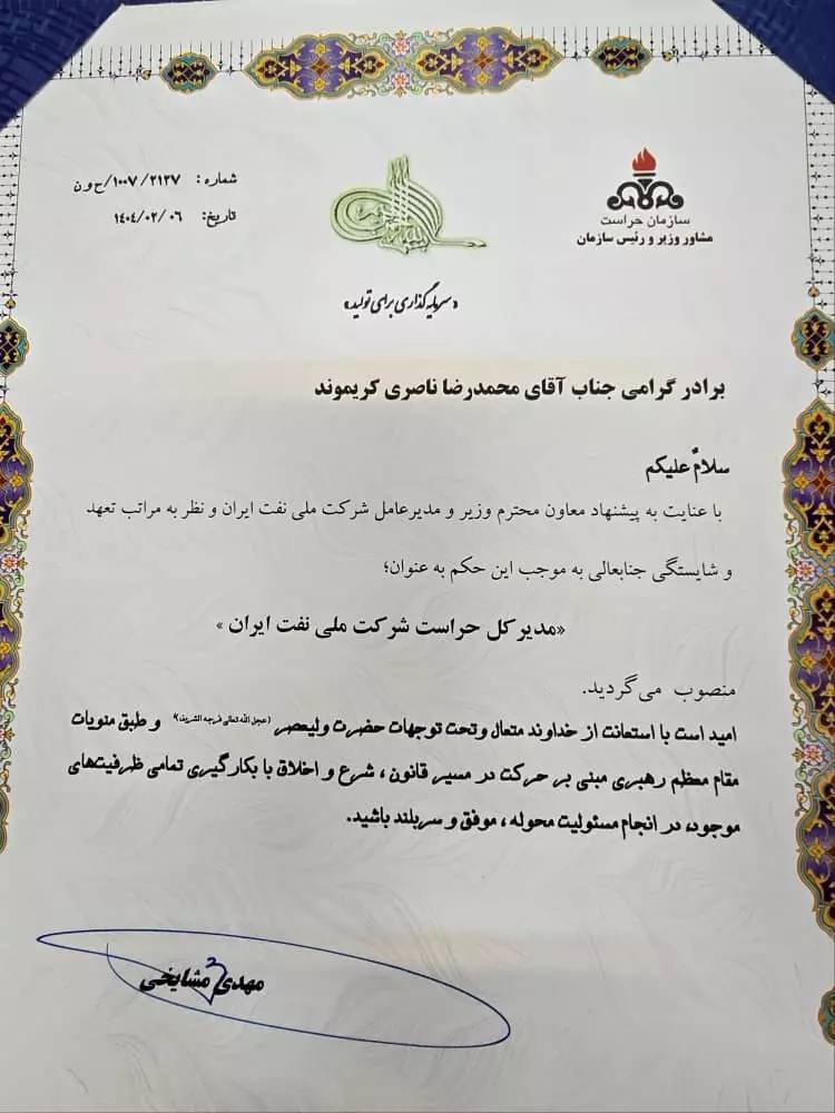 مهندس محمدرضا ناصری کریموند از مدیران خوش نام ، متخصص و با تجربه طولانی در سازمان حراست صنعت نفت، با حکم مهدی اخوان مشایخ، به ریاست حراست شرکت ملی نفت ایران منصوب شد.