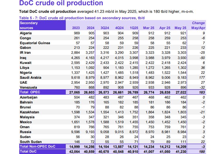 عربستان با تولید روزانه ۹ میلیون و ۱۸۳ هزار بشکه، عراق با تولید روزانه ۳ میلیون و ۹۳۰ هزار بشکه و ایران با تولید روزانه ۳ میلیون و ۳۰۳ هزار بشکه سه تولیدکننده بزرگ اوپک در ماه مه ۲۰۲۵ هستند.