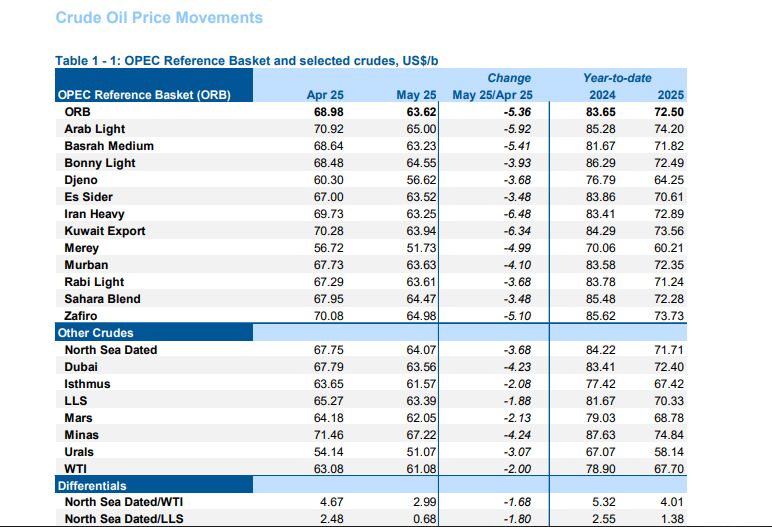 قیمت سبد نفتی اوپک هم در ماه مه به ۶۳ دلار و ۶۲ سنت برای هر بشکه رسید که این مقدار، ۵.۳۶ دلار (۷.۷ درصد) کمتر از ماه آوریل ۲۰۲۵ است. قیمت نفت خام سنگین ایران در ماه مه به ۶۳ دلار و ۲۵ سنت برای هر بشکه رسید که این مقدار ۶ دلار و ۴۸ سنت کمتر از ماه آوریل بوده است. میانگین قیمت نفت سنگین ایران در سال ۲۰۲۴ برابر با ۸۳ دلار و ۴۱ سنت ثبت شده است.
