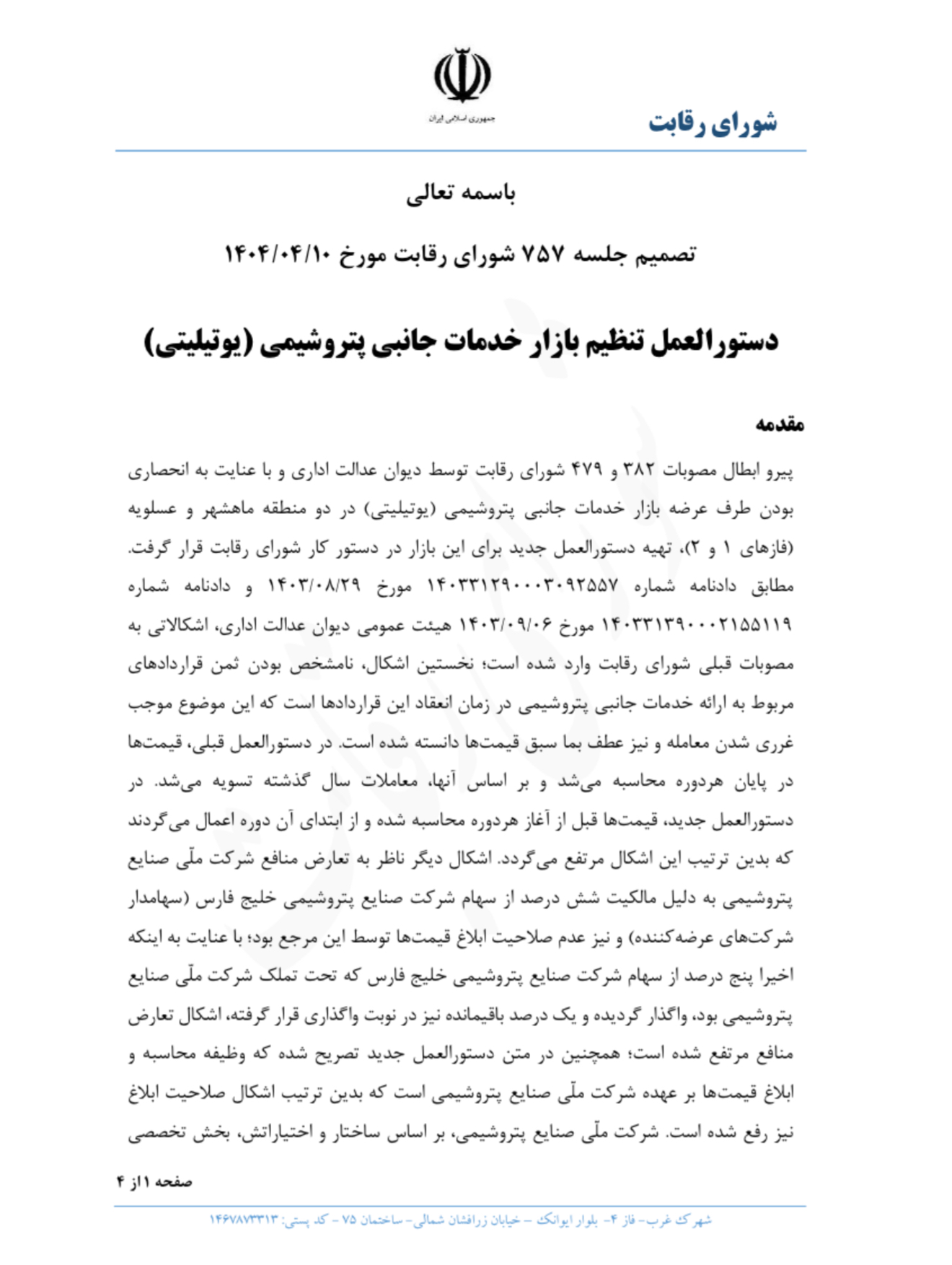شورای رقابت با توجه به انحصاری بودن طرف عرضه بازار خدمات جانبی پتروشیمی (یوتیلیتی) و پیرو ابطال مصوبات ۳۸۲ و ۴۷۹ شورای رقابت توسط دیوان عدالت اداری، با رفع اشکالات طرح شده توسط دیوان عدالت اداری، دستورالعمل جدید تنظیم بازار خدمات جانبی پتروشیمی (یوتیلیتی) را تصویب کرد.