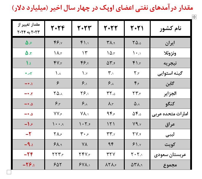 بر همین اساس ایران در سال ۲۰۲۴، بیش از ۴۶ میلیارد و ۷۷۶ میلیون دلار درآمد حاصل از صادرات نفت کسب کرده که این مقدار در سال ۲۰۲۳ نزدیک به ۴۱ میلیارد و ۱۲۹ میلیون دلار بوده است. پس از ایران، ونزوئلا بهترین عملکرد را به لحاظ افزایش درآمدهای نفتی به خود اختصاص داده و از ۱۳ میلیارد و ۸۸ میلیون دلار در سال ۲۰۲۳ به ۱۸ میلیارد و ۳۷۲ میلیون دلار در سال ۲۰۲۴ رسیده است.