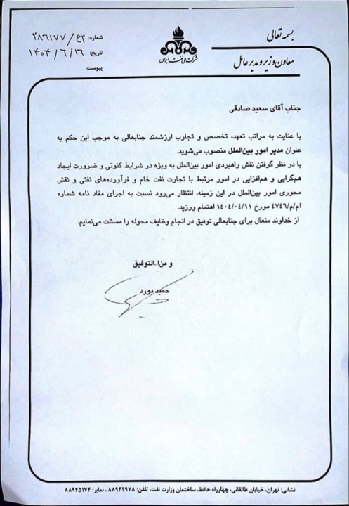 به گزارش رویداد نفت به نقل از شرکت ملی نفت ایران، در حکم حمید بورد به سعید صادقی آمده است: