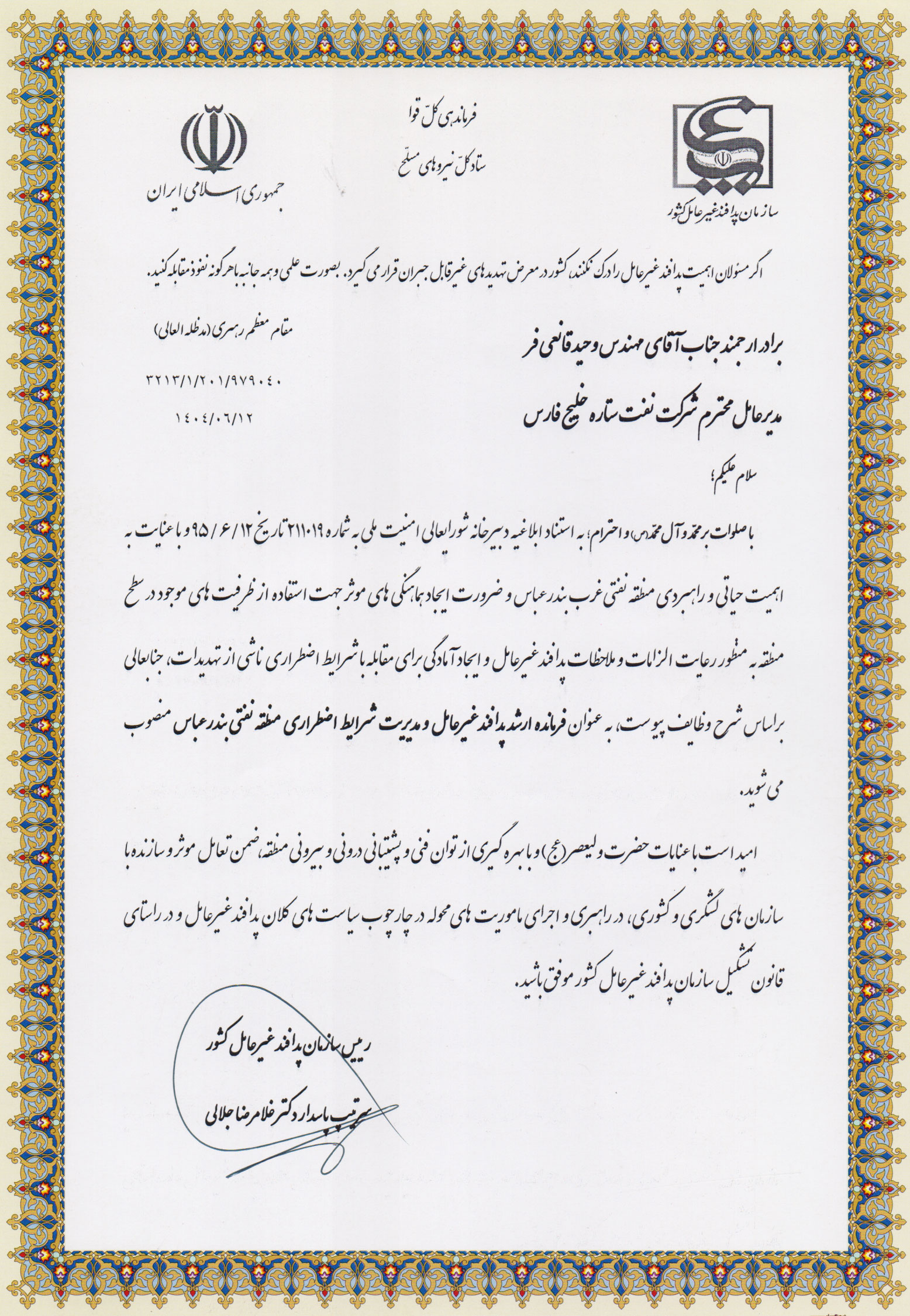 انتصاب مدیرعامل شرکت نفت ستاره خلیج فارس به عنوان فرمانده ارشد پدافند غیرعامل و مدیریت شرایط اضطراری منطقه نفتی بندرعباس
