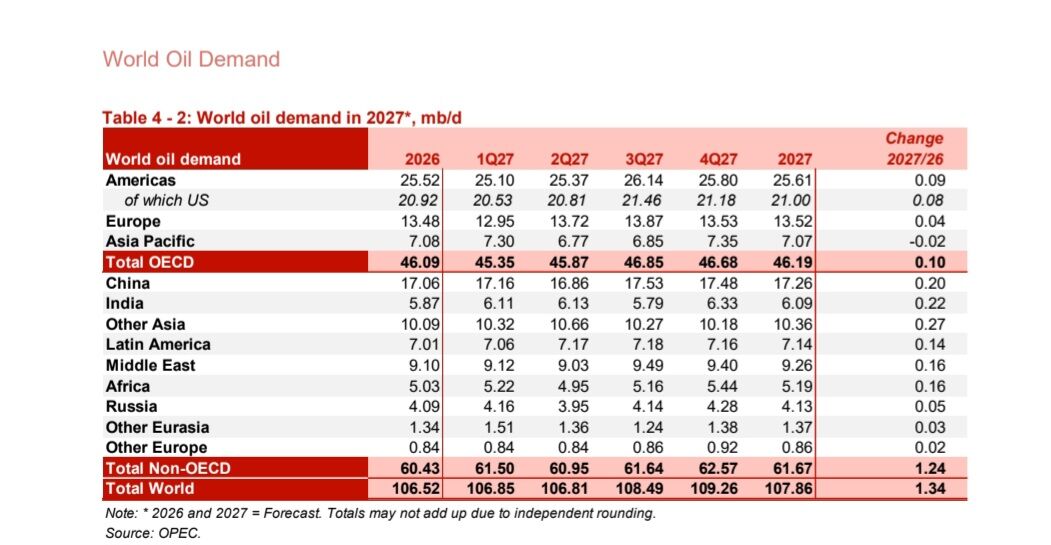 بر اساس تازهترین گزارش ماهانه دبیرخانه اوپک (ژانویه ۲۰۲۶)، تقاضای جهانی نفت خام برای سال ۲۰۲۷ با یک میلیون و ۳۴۰ هزار بشکه افزایش روزانه همراه خواهد بود. مجموع تقاضای نفت جهان برای سال ۲۰۲۶، ۱۰۶ میلیون و ۵۲۰ هزار بشکه و برای سال ۲۰۲۷ ۱۰۷ میلیون و ۸۶۰ هزار بشکه پیشبینی شده است.