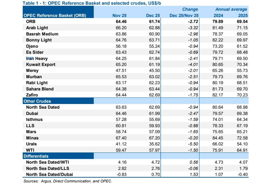 به گزارش رویداد نفت به نقل از دبیرخانه سازمان کشورهای صادرکننده نفت (اوپک)، تولید نفت ۱۲ کشور عضو این سازمان بر اساس تازهترین گزارش (ماه ژانویه ۲۰۲۶)، در ماه دسامبر ۲۰۲۵ (آذر – دی)، درمجموع ۲۸ میلیون و ۵۶۴ هزار بشکه در روز بوده که نسبت به ماه نوامبر (آبان – آذر)، ۱۰۵ هزار بشکه در روز افزایش داشته است.