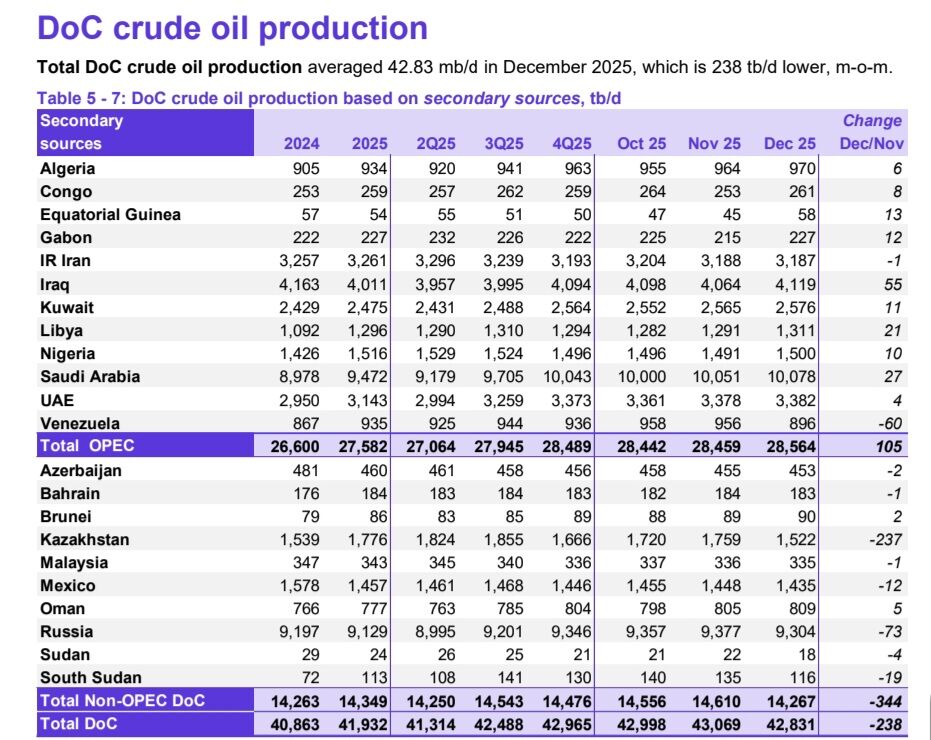 عربستان با تولید روزانه ۱۰ میلیون و ۷۸ هزار بشکه و عراق با تولید روزانه ۴ میلیون و ۱۱۹ هزار بشکه تولیدکنندگان بزرگ اوپک در ماه دسامبر ۲۰۲۵ بودند.