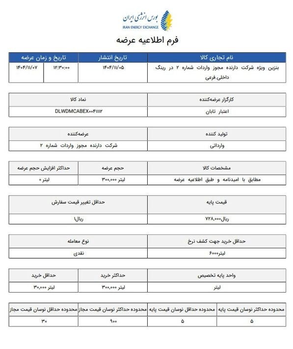 تازهترین قیمت بنزین سوپر وارداتی در بورس انرژی، ۷۲ هزار و ۸۰۰ تومان تعیین شد.