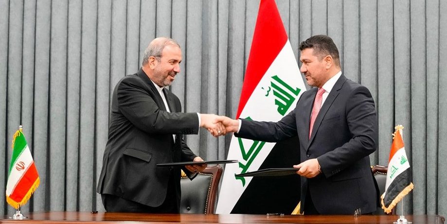 Ihsan Al-Awadi, Chief of Staff to the Iraqi Prime Minister (right) and Mohammad Kazem Al Sadeq, Iranian Ambassador to Iraq, sign an agreement to swap Iraqi oil for Iranian gas supplies on July 11, 2023. (Iraqi Prime Minister’s Media Office)