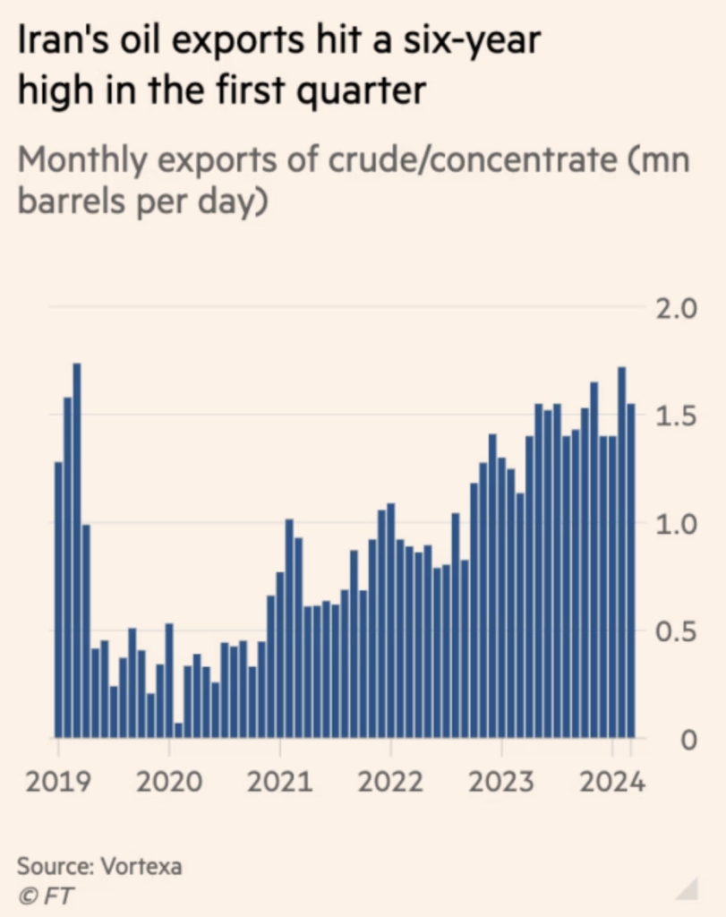 Tehran sold an average of 1.56mn barrels a day during the first three months of the year, almost all of it to China and its highest level since the third quarter of 2018, according to data company Vortexa.
