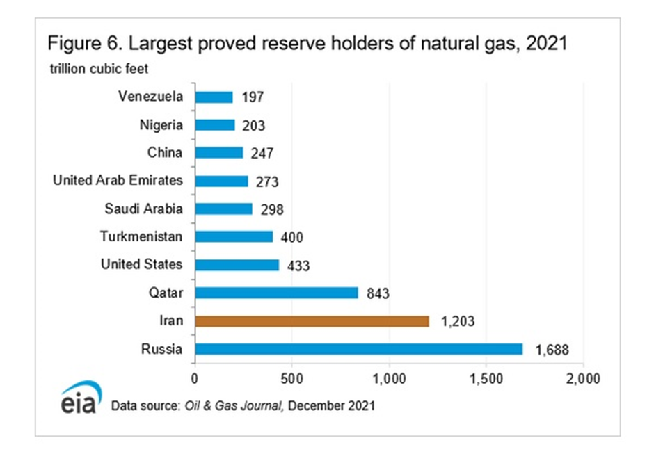 Iran’s estimated proved natural gas reserves were 1,203 trillion cubic feet (Tcf) as of December 2021, second only to Russia, according to Oil & Gas Journal. Iran holds 17% of the world’s proven natural gas reserves and almost half of OPEC’s reserves.
