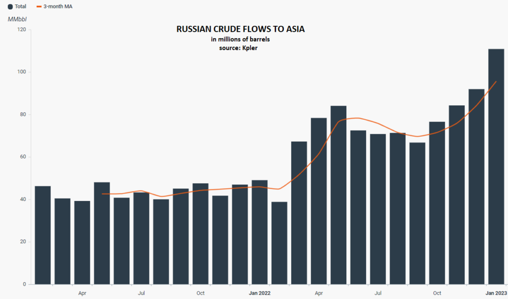 Western Sanctions have led Russia to sell more than twice as much crude to Asia in the year to January, according to Kpler data. Iran, under U.S. sanctions, has boosted exports to the highest in three years on some estimates, with China the biggest buyer.