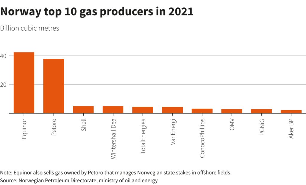 However, the biggest player is Equinor (EQNR.OL), majority-owned by the Norwegian state. It produced more than 45 billion cubic metres of natural gas, roughly 36% of total Norwegian production of 123.8 bcm in 2022.