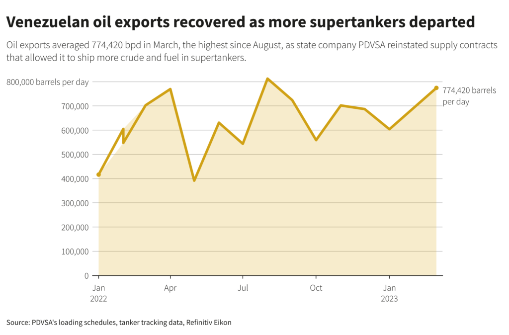 Oil exports averaged 774,420 bpd in March, the highest since August, as state company PDVSA reinstated supply contracts that allowed it to ship more crude and fuel in supertankers.