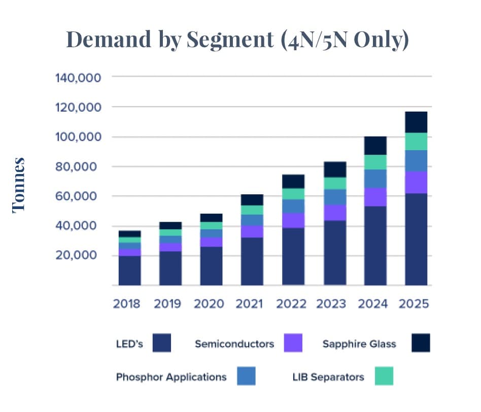 Alumina is a highly valuable mainstay of countless industries. At its highest grades, it is used in LED lighting, semiconductors, electric vehicle batteries–and all of today’s key consumer electronics. At its lowest grades, it is used as an industrial abrasive and in the production of aluminum.