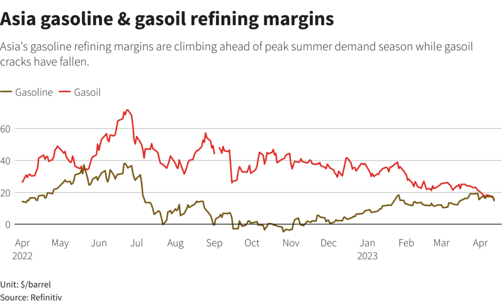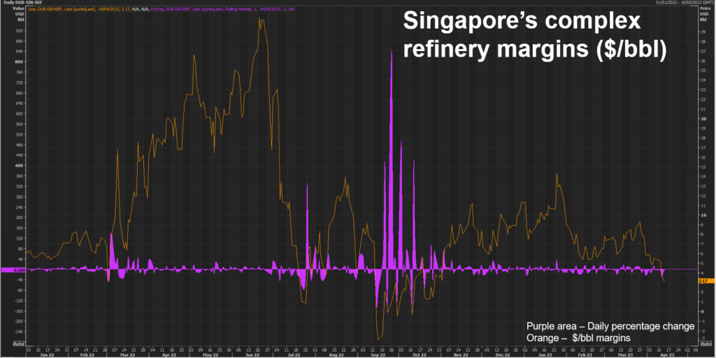 Complex refinery margins in Singapore , the bellwether for Asian refining margins, have more than halved to $3.17 a barrel – the lowest since October 2022 – from an average of $7.56 in March.