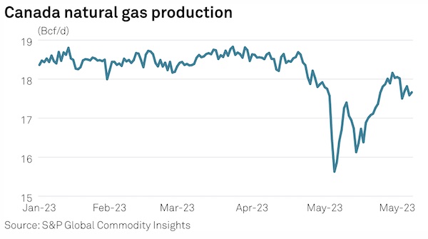 Total Canadian gas production was estimated at 17.7 Bcf/d June 7—down from a peak of more than 18 Bcf/d in late May. Prior to the outbreak of wildfires across Alberta in early May, Canadian gas production had averaged about 18.5 Bcf/d from January through April, legacy IHS PointLogic data from S&P Global Commodity Insights showed.