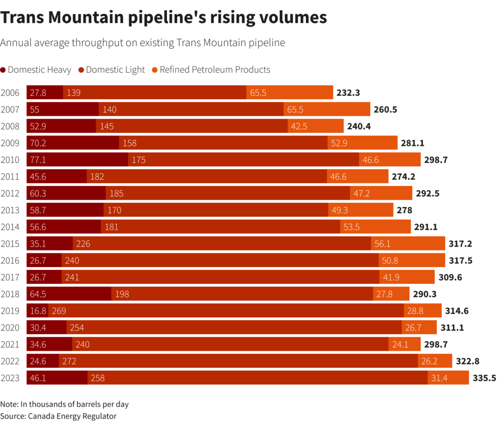 TMX next year is due to start shipping an extra 590,000 barrels per day (bpd) of crude early from Alberta to British Columbia’s Pacific Coast, where it will be loaded onto tankers for export.
