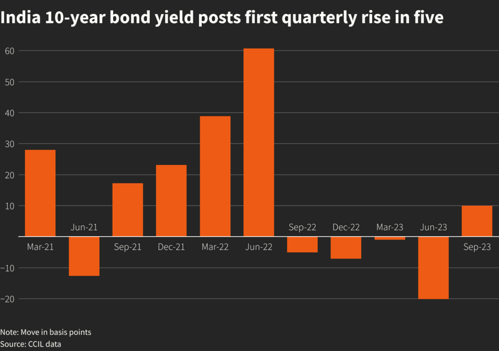 India 10-year yield posts first quarterly rise in 5 on rising oil, US peers