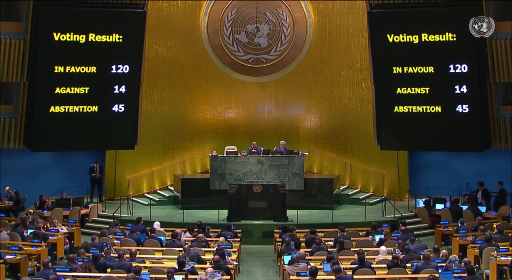 The General Assembly on Friday approved the resolution, drafted by Arab countries, which called for an immediate humanitarian ceasefire and the cessation of hostilities in Gaza. 120 countries voted in favor, 14 voted against the resolution, and 45 abstained.