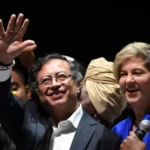 Newly elected Colombian President Gustavo Petro, centre, celebrates next to his wife Veronica Alcocer and his running mate Francia Marquez in Bogota, on Sunday after winning the…